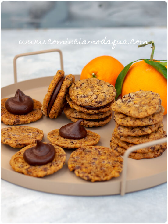 Per assemblare i biscotti, tagliate la punta della sac à poche preparata con la ganache all’arancia. Spalmate la ganache su un biscotto e copritelo con un altro a creare il sandwich.