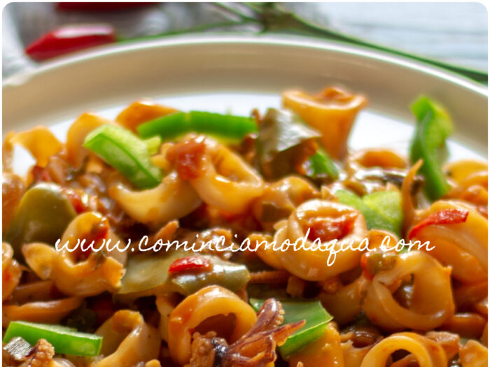 I calamari piccanti in salsa di ostriche con peperoni verdi sono un’altra ricetta facile e veloce che ci propone Ching-He Huang autrice del libro Stir-Crazy.