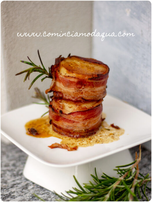 Avvolgete una fetta di bacon attorno a ogni cilindro e fissatela forandola con un rametto di rosmarino.